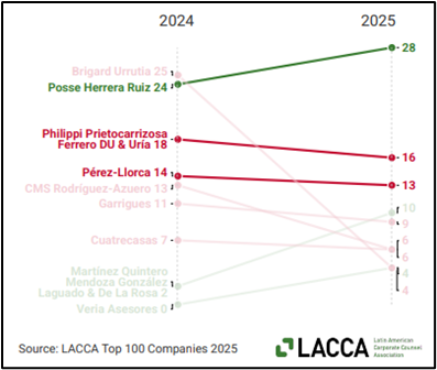 En la edición 2025, aunque las firmas brasileñas e internacionales mantienen un peso dominante en el ranking regional, los movimientos en los mercados locales cuentan una historia de éxito propia. En Colombia, la firma Posse Herrera Ruiz ha alcanzado el primer lugar al asesorar a 28 de las 100 empresas más grandes de la región. Esta cifra representa un incremento de cuatro compañías frente al año anterior, permitiéndole ascender de la segunda a la primera posición.